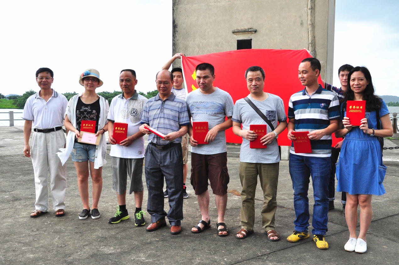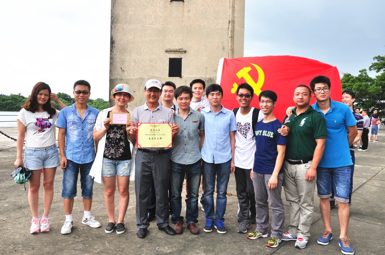 參觀當(dāng)天,艷陽(yáng)高照,在歡聲笑語(yǔ)的旅游車上,建黨紀(jì)念活動(dòng)首先在熱烈的黨史知識(shí)有獎(jiǎng)問(wèn)答競(jìng)賽拉開(kāi)了帷幕。當(dāng)答題告罄,獎(jiǎng)品紛紛易主時(shí),汽車就抵達(dá)開(kāi)平南樓。該樓建于1921年,樓高七層19米,每層均有機(jī)槍和探照燈,是司徒氏人為防盜賊而建。抗戰(zhàn)時(shí)期,七名歸僑及僑屬青年曾在此堅(jiān)守八天九夜痛擊日軍,最后彈盡糧絕,壯士全部捐軀。七壯士雕塑雄壯威武,英靈如塔,藍(lán)天之下,民族精神直沖云霄。我們就在當(dāng)年這一浴血奮戰(zhàn)的所在默默地緬懷,莊重地對(duì)獲得2015年度先進(jìn)黨支部和優(yōu)秀黨員進(jìn)行表彰,展開(kāi)鮮艷的黨旗合影……過(guò)程中,我們幾乎聽(tīng)到烈士群像的呼吸。